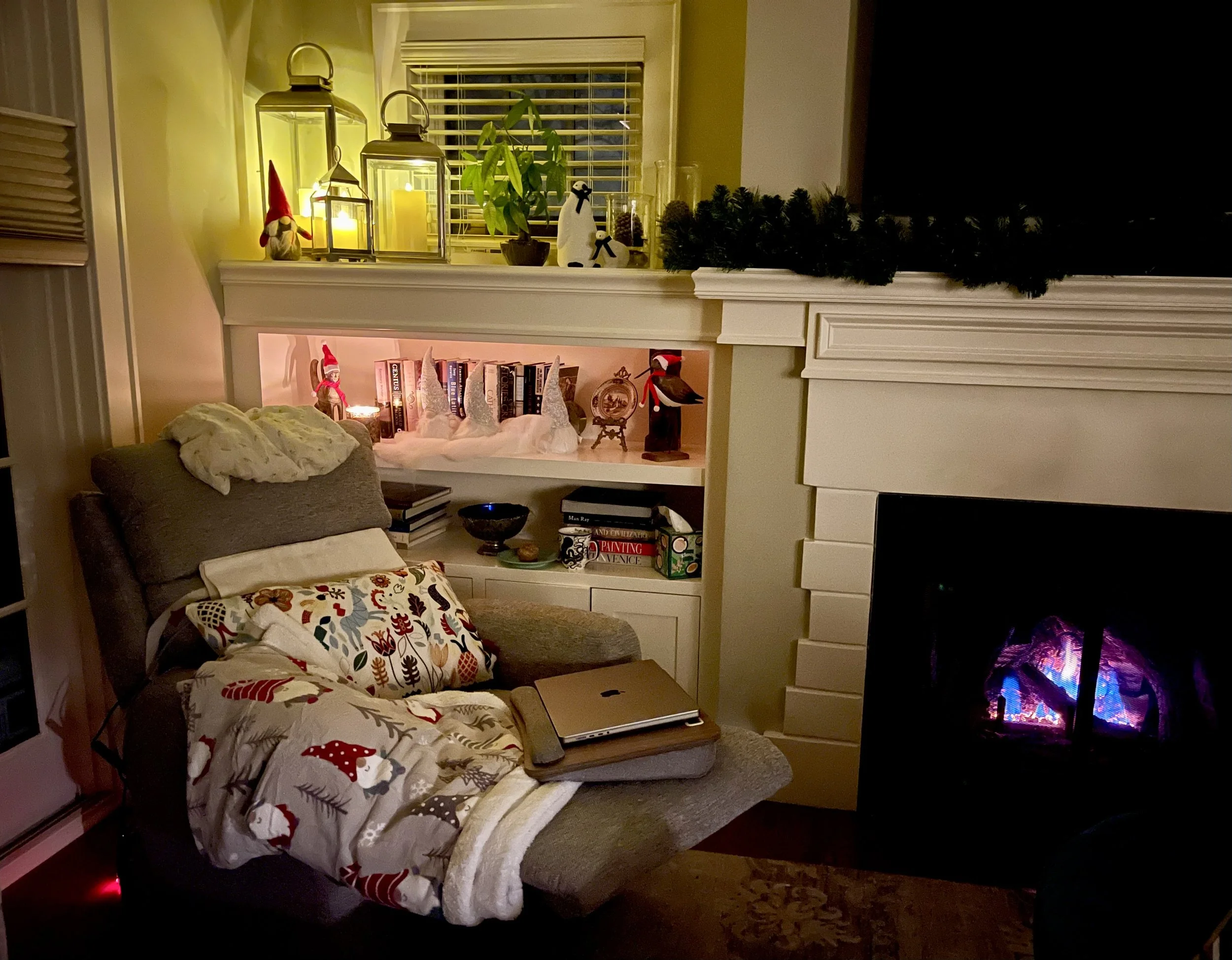 I tried my old stand-bys – making a strong cup of tea with honey and oat milk and sitting on my exercise ball – which promptly ended with me on the floor covered in hot liquid. Obviously, I needed a new, stable place to sit. I finally settled on a soft recliner that faintly smelled of cat, but had great neck support that allowed my muscles to rest while I typed. Finding the perfect distance between me and the screen proved harder though. Too near and all the words were blurry, too far and I saw two computer screens. A couch pillow on my lap with my computer perched on top, about a foot away from my eyes, was the best solution. Other supports: Heating pad for my lower back, ice pack behind my neck, rolled up blankets under my arms for support, space heater and fan (going through menopause with hot flashes, but also living with a disease that messes with circulation is quite . . .something), and a side table with my meds, food, drinks and phone. Also, I have my IPad cued to the synonym site because word retrieval is still a bitch.